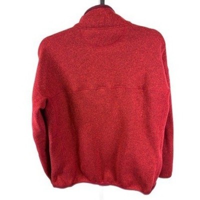 Patagonia women's red fleece snap-T pullover sweatshirt. This cozy top features a classic snap-button placket at the neck and a comfortable stand-up collar. The textured fleece fabric offers warmth and durability, making it perfect for layering on chilly days. Ideal for outdoor adventures, casual weekend wear, or relaxed evenings by the fire.