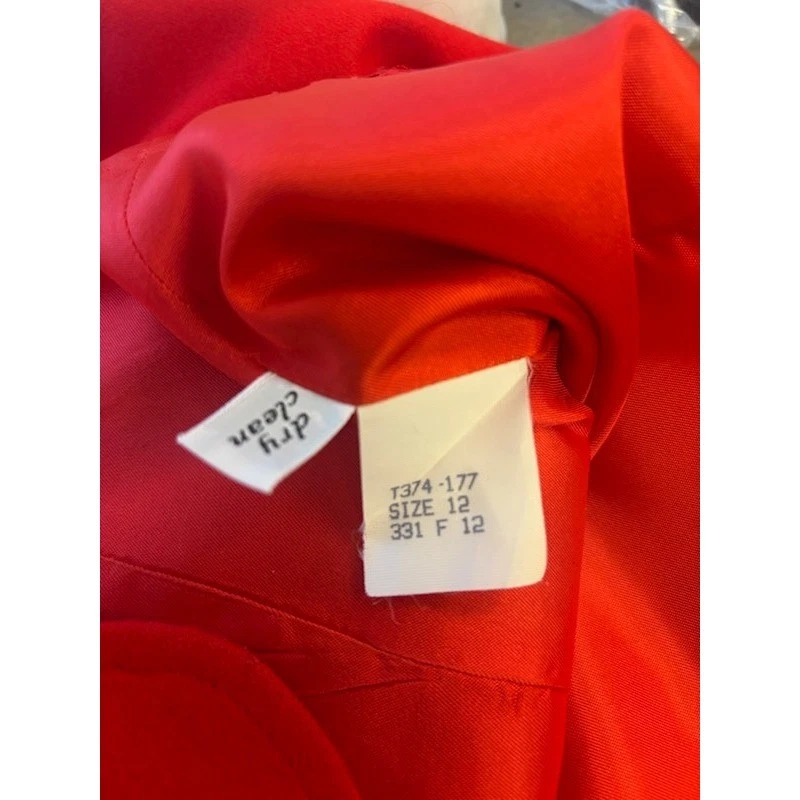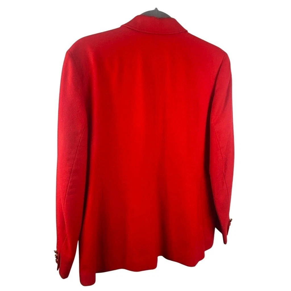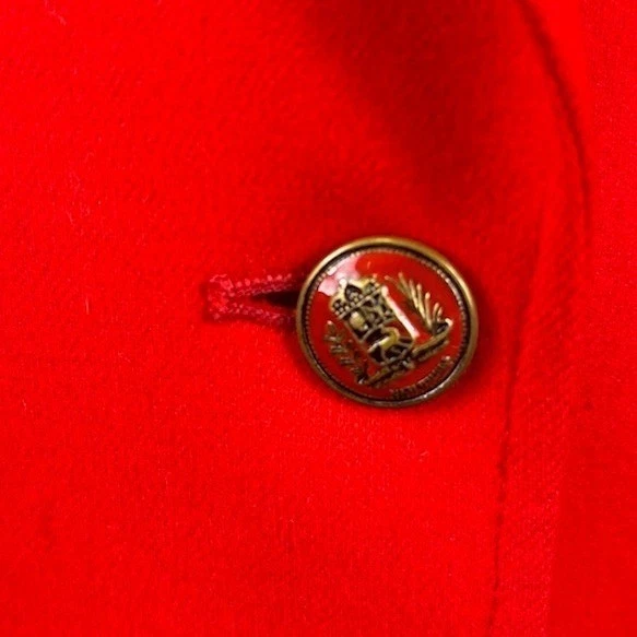 This Vintage Pendleton red wool blazer jacket measures 27 inches in length, 21 inches pit to pit laid flat and has a 24 inch sleeve length. Single button front closure with ornate gold crest buttons. Two flap pockets at the hip. Fully lined interior. Perfect for a polished office look or a chic evening out.