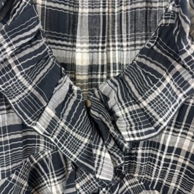 Plaid ruffle V-neck long sleeve shirt. This stylish top features a flattering V-neckline with cascading ruffles that add a feminine touch. The classic plaid pattern in shades of black, white, and gray offers a versatile look that can be dressed up or down. Long sleeves with ruffled cuffs complete the charming design, making it a perfect choice for a casual day out, a weekend brunch, or a cozy evening gathering.