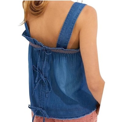 Whispers of bohemian charm meet modern comfort in this delightful denim top. The smocked bodice, framed by a playful ruffle and delicate embroidered trim, adds a touch of effortless femininity. Adjustable shoulder straps and a subtly frayed hemline complete the look, creating a relaxed yet stylish vibe. The lace-up detail in the back gives it a unique and customizable fit. Perfect for a sunny picnic, a casual brunch with friends, or a stroll through a weekend market, this top is sure to become a warm-weather favorite.