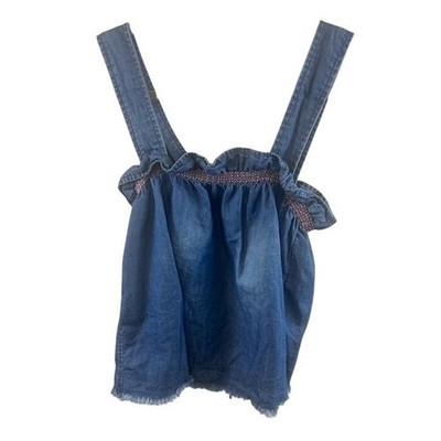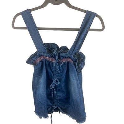 Keywords: Pilcro, Denim Top, Ruffle Top, Smocked Top, Chambray Top, Sleeveless Top, Bohemian Style, Summer Tank, Casual Top, Size Small, Blue Top, Festival Top, Embroidered Top