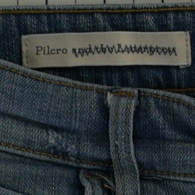 Anthropologie Pilcro and the Letterpress denim shorts offer a unique bohemian flair with colorful embroidered whipstitch detailing along the side seams. These light wash blue jean shorts feature a classic five-pocket construction, a zip fly with button closure, and intentional distressing including a shredded front panel and raw, frayed hems for a lived-in look. The soft denim fabric provides comfort while the vibrant stitching adds a playful pop of color to a summer staple.