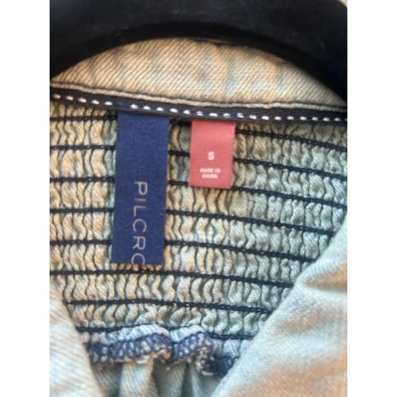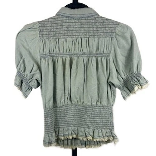 Unique smocked denim top featuring a collared neckline and button-down front. Details include a stretchy, smocked bodice and shoulder yoke, creating a fitted silhouette that accentuates the waist. The design is complemented by short puff sleeves with elasticated cuffs, which also have delicate frayed trim. Perfect for creating a casual chic look, this top can be worn for a relaxed weekend brunch, a garden party, or a stylish everyday outfit.