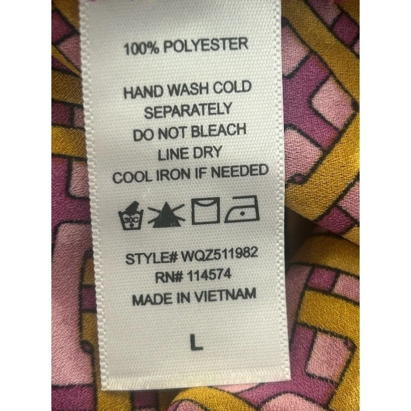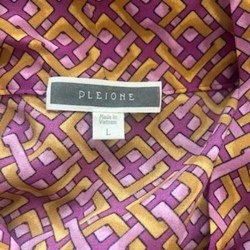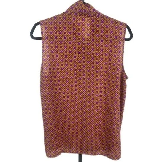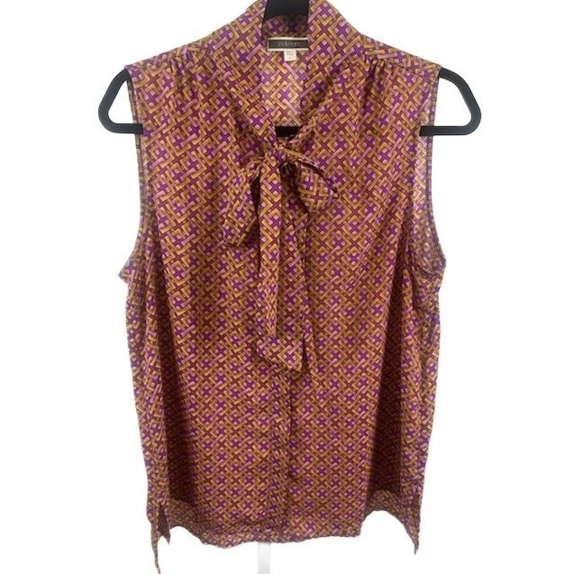 A sleeveless bow-neck blouse in a striking geometric print. This top offers a sophisticated silhouette with its tie-neck detail and flowing fabric. It’s perfect for a business casual setting or a stylish evening out.