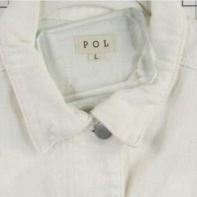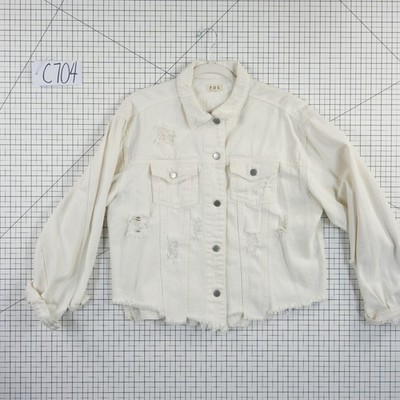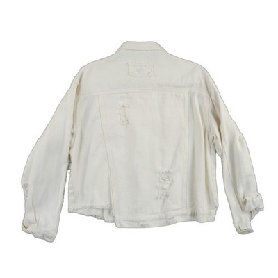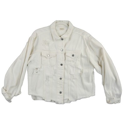 Excellent condition! POL Clothing white denim jacket features a heavily distressed design with frayed edges and a raw hem for a rugged, lived-in look. Crafted from 100% cotton, this oversized trucker style includes classic metal button closures, chest flap pockets, and a pointed collar. The cream-toned off-white wash adds a vintage feel to the relaxed silhouette, making it a versatile layering piece for casual outfits.