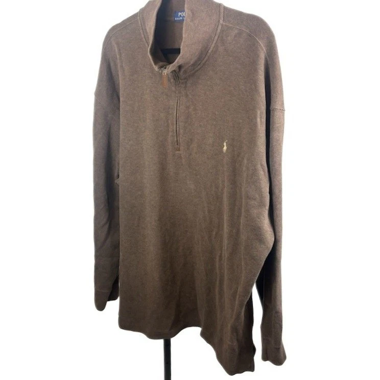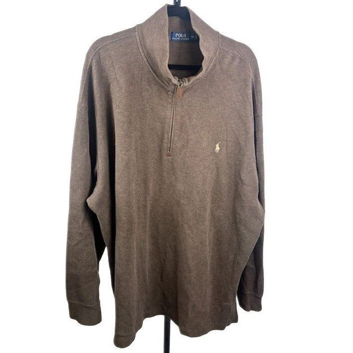 A brown Polo Ralph Lauren quarter zip pullover sweater for men. This classic knitwear piece features a comfortable stand-up collar and a convenient half-zip placket, adorned with the iconic Polo Ralph Lauren pony logo embroidered on the chest. Its versatile design makes it a perfect choice for casual outings, layering during cooler weather, or adding a touch of preppy style to your everyday wardrobe.