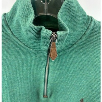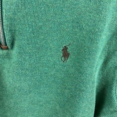 This Polo Ralph Lauren green quarter zip pullover sweatshirt measures 25 inches in length, has a 23 inch sleeve length and is 21 inches pit to pit laid flat. This classic top features a high neckline with a quarter zip closure and a subtle embroidered pony logo on the chest. Perfect for casual outings or layering on cooler days. Pre-owned but in in excellent condition with no rips, holes or stains.