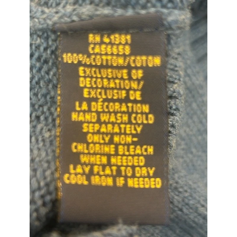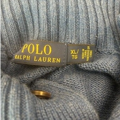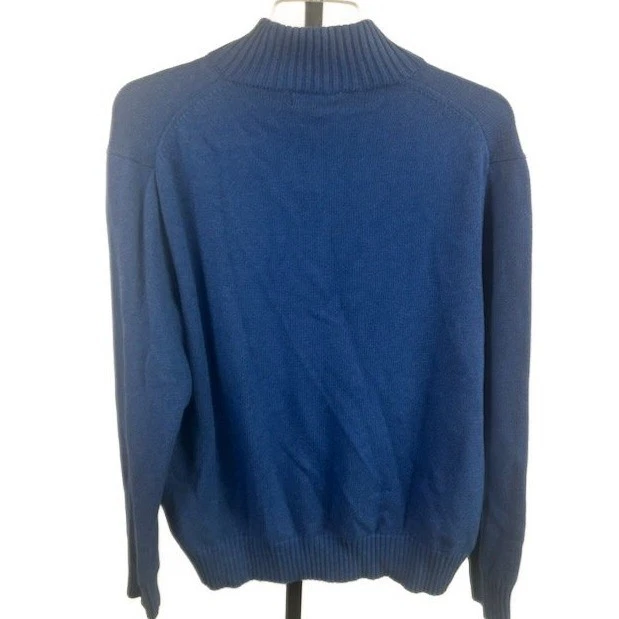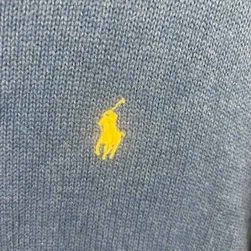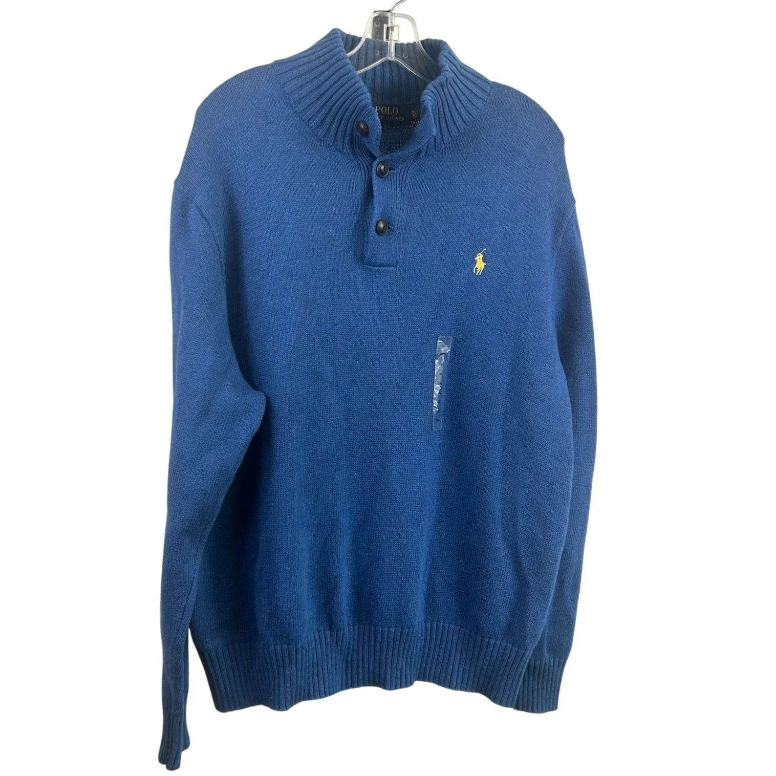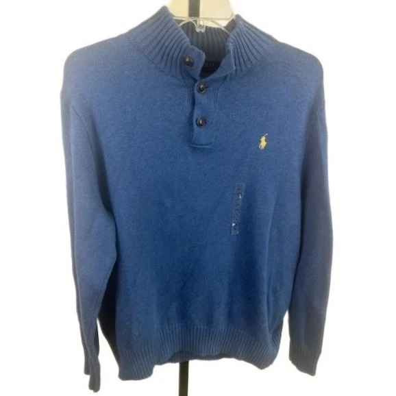 A classic Polo Ralph Lauren blue cotton knit sweater. This pullover features a stylish mock neck with a two-button placket and the iconic yellow embroidered Polo player logo on the chest. The ribbed cuffs, hem, and neckline provide a comfortable and secure fit. Perfect for a casual day out, a round of golf, or a relaxed evening.
