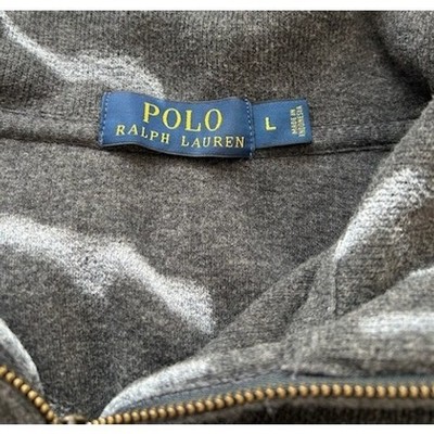 Polo Ralph Lauren quarter zip sweater in heathered gray. Long sleeves and a mock neck collar for a classic look. A subtle red embroidered logo adorns the chest. Perfect for casual outings or layering for a smart casual ensemble.
