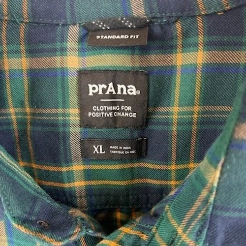 Excellent condition! This Prana men’s long sleeve 100% cotton button-up shirt in a classic green navy plaid measures 34″ in sleeve length, and 34″ pit-to-pit when laid flat. Features two chest pockets with button closures and a standard fit for comfortable wear. Ideal for layering on cool evenings or as a standalone piece for casual outings.