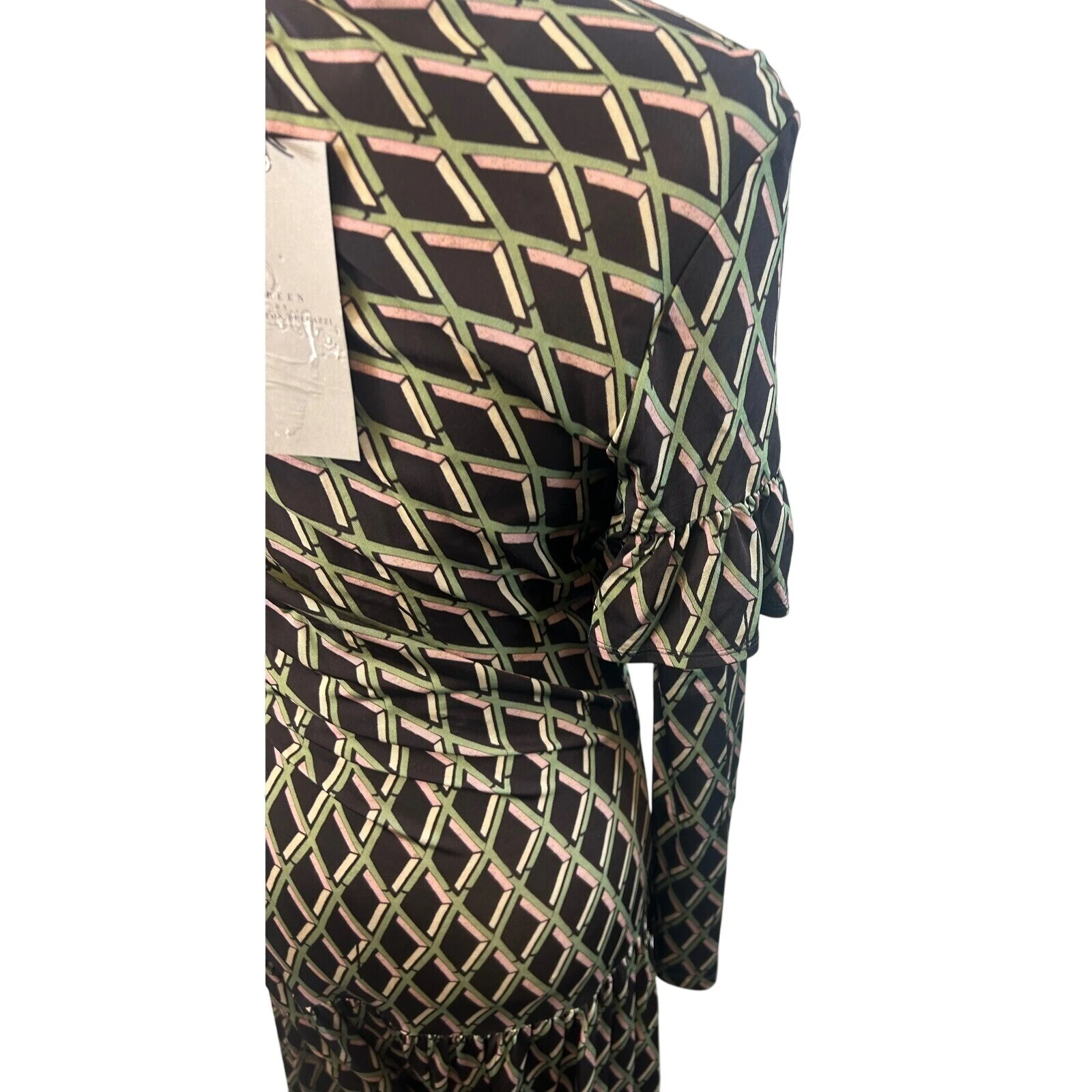 Command attention in this Preen by Thornton Bregazzi maxi dress, a captivating statement piece that blends modern artistry with timeless elegance. A mesmerizing geometric print in black, green, and pink dances across the flowing fabric, creating a visually stunning effect. The dress features long sleeves, a flattering round neckline, and unique ruching detail at the front, adding a touch of sophistication and texture. The tiered skirt adds movement and grace, making it a joy to wear. Perfect for a chic cocktail party, a sophisticated dinner date, or an unforgettable evening event, this dress is sure to turn heads and leave a lasting impression.