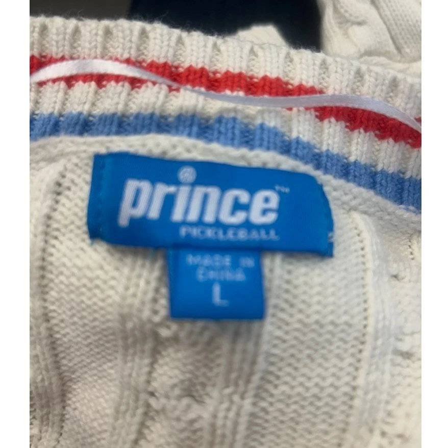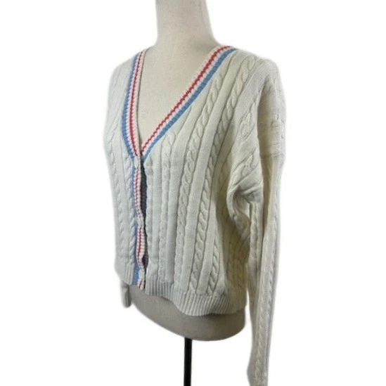 Cream cable knit cardigan sweater from Prince Pickleball. Features a V-neckline with red and blue striped trim and button-front closure. This cozy knit is perfect for a casual day out or layering for cooler weather.