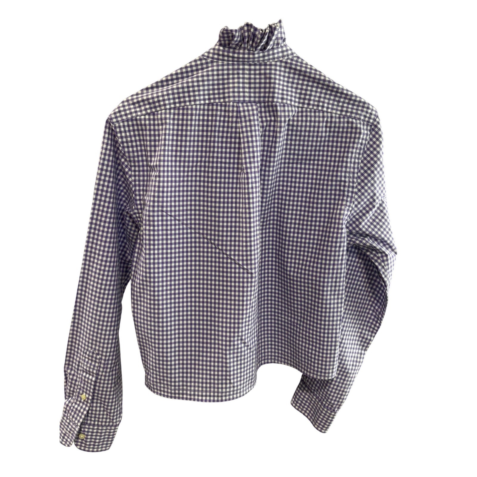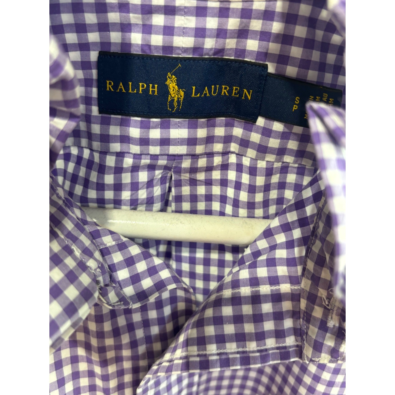 Ralph Lauren button-down shirt showcases a classic gingham pattern in a vibrant purple and white colorway. The standout feature is a high ruffled collar that adds a Victorian-inspired touch to a traditional preppy staple. Crafted from crisp cotton, it includes long sleeves with buttoned cuffs and the iconic green pony logo embroidered on the chest. The tailored fit and unique neckline make it a versatile piece for both professional settings and elevated casual wear.