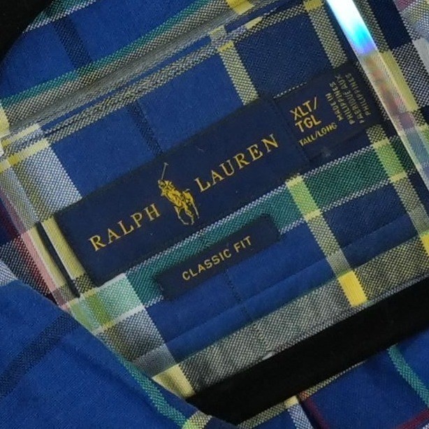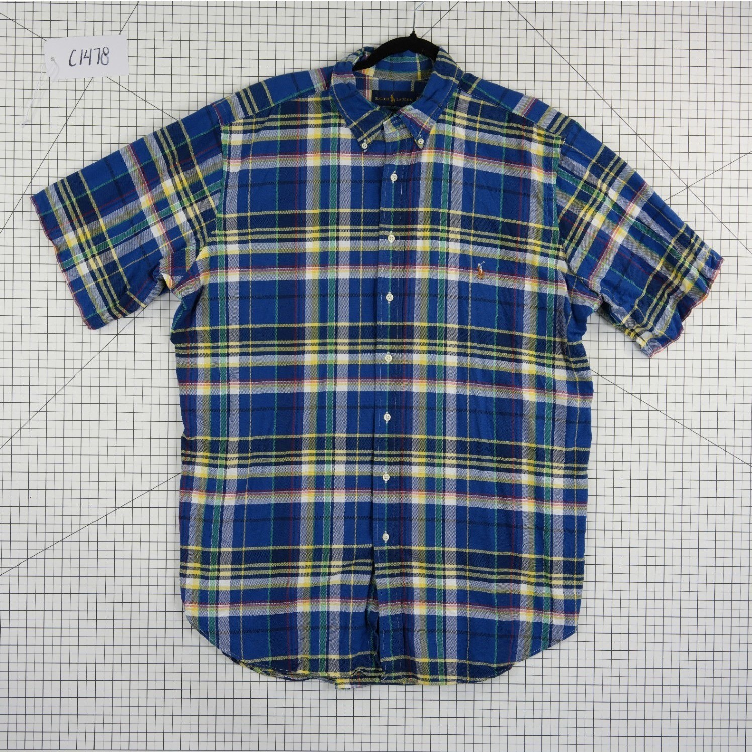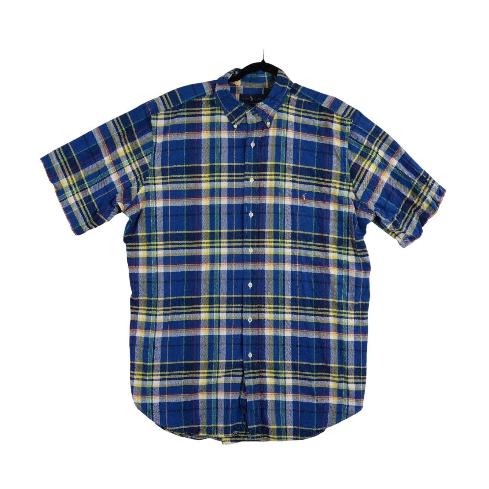 Excellent Condition! Ralph Lauren button-down shirt in a vibrant blue plaid pattern with yellow and green accents. This short-sleeve top features a classic button-down collar and the iconic multi-color pony embroidery on the chest. Crafted from breathable cotton, it offers a comfortable classic fit with a curved hem and a box pleat at the back for added mobility. Ideal for casual outings or smart-casual office wear.