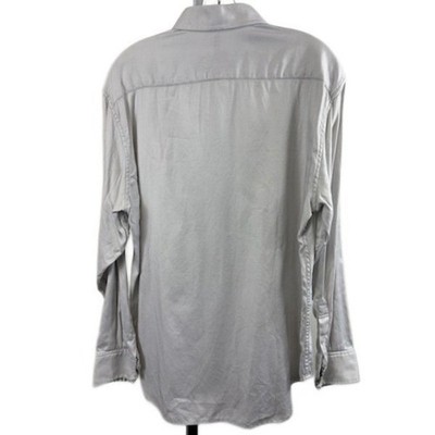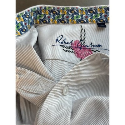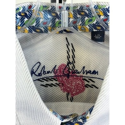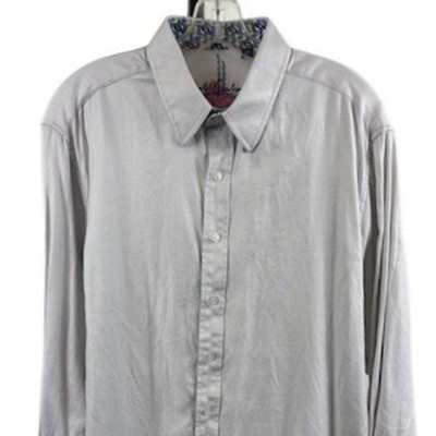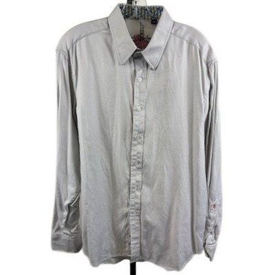 Keywords: Robert Graham shirt, designer button up, mens fashion, textured fabric, paisley print, embroidered detail, smart casual, business casual, long sleeve, silver shirt, unique design, menswear
