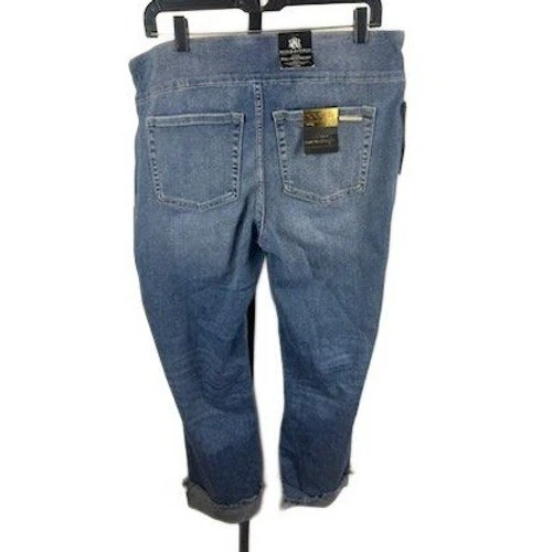 Stylish pull-on straight leg jeans from Rock & Republic. These mid-rise jeans feature an ultra-slim fit through the hip and thigh, with a straight leg opening that provides a flattering silhouette. The design incorporates distressed detailing at the knees for a touch of edgy style, complemented by a cuffed hem that can be worn straight or cuffed, offering versatility for different looks. Perfect for casual outings, weekend adventures, or relaxed evenings at home.