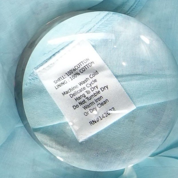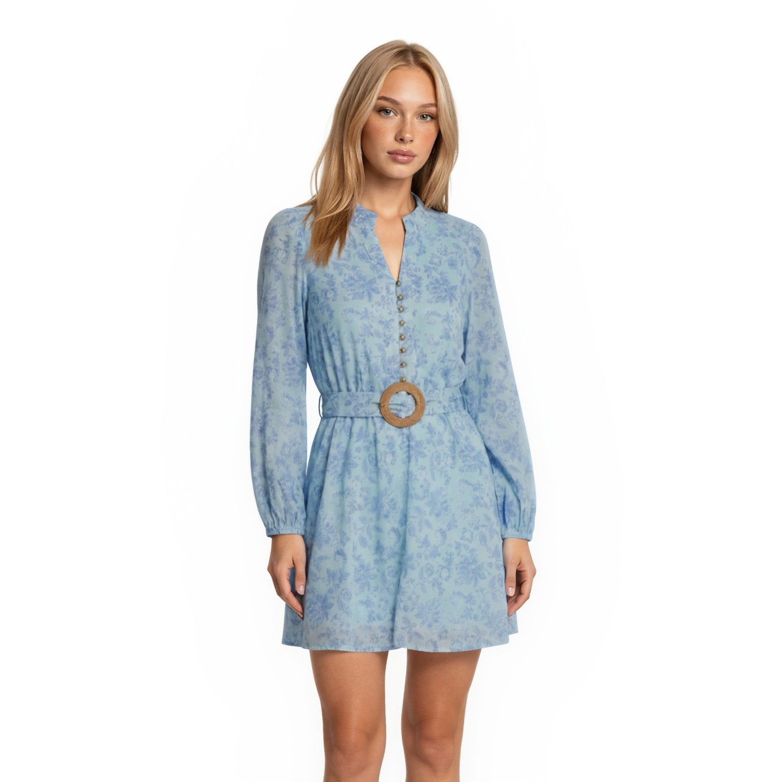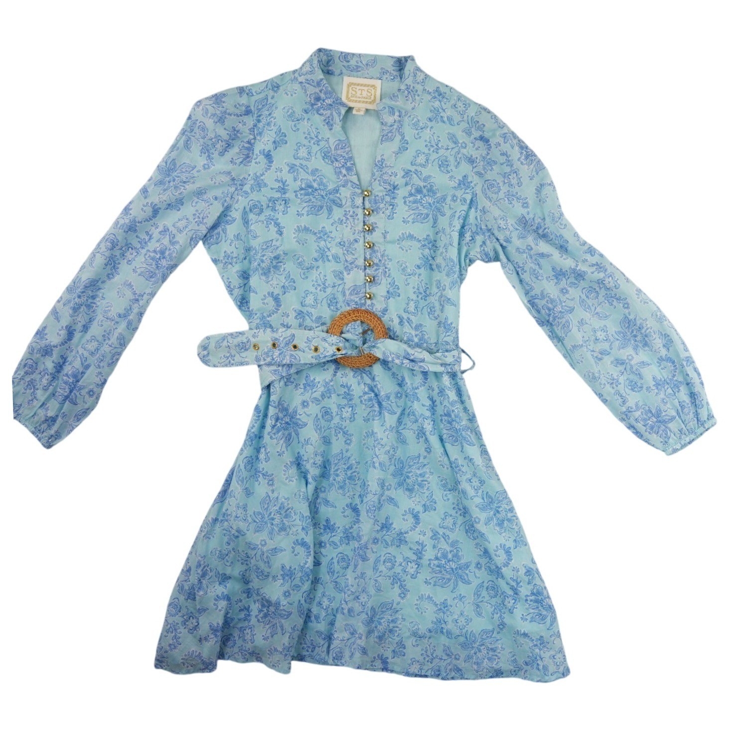 Excellent Condition! Lightweight cotton mini dress showcases a charming blue floral block print throughout. Designed with a split neckline and gold-tone button detailing, this long-sleeve piece features a matching belt with a woven straw buckle for a defined waist. The breathable cotton fabric and relaxed fit make it an ideal choice for coastal vacations or warm-weather outings.