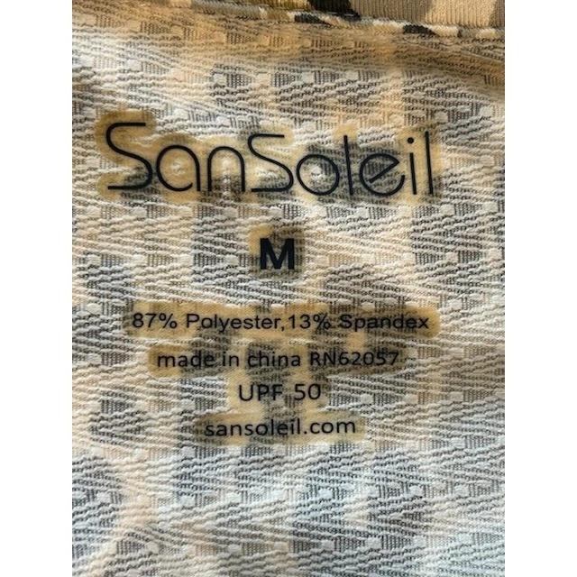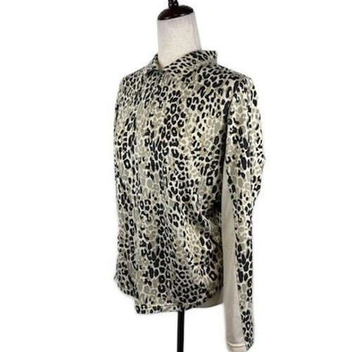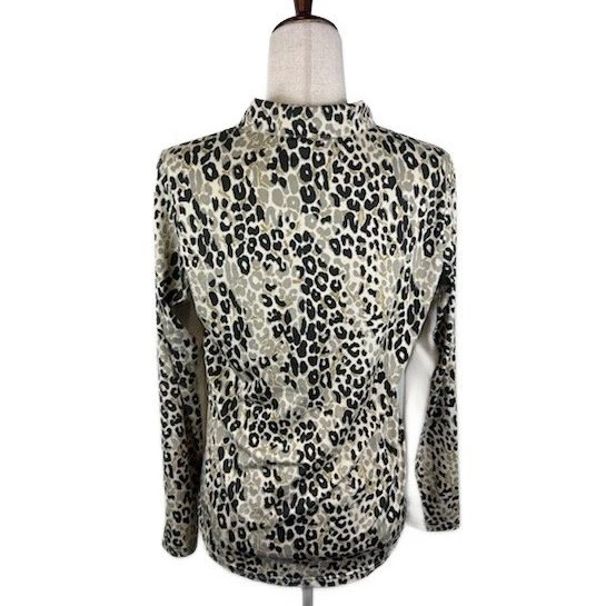 Chic and sun-protective top, perfect for both the golf course and casual outings. This stylish SanSoleil long-sleeve shirt features a striking leopard print in neutral tones, adding a touch of wild sophistication to your wardrobe. The design incorporates a classic collared neckline and a partial button placket, offering versatility in styling. Crafted with UPF 50 sun protection, it’s ideal for safeguarding your skin during outdoor activities. Lightweight and breathable, this top ensures comfort and ease of movement. Great for a day on the green, a casual lunch, or even travel.