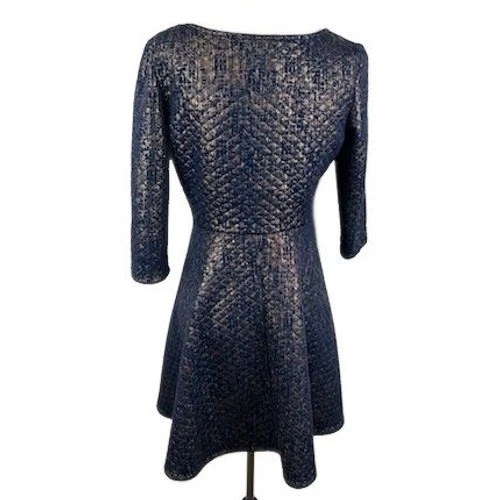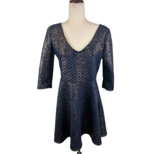 SHE Dress Women’s Size Medium Navy Gold Textured V-Neck 3/4 Sleeve Fit & Flare