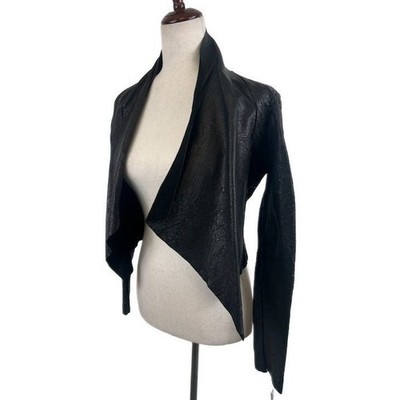 Excellent condition! Shelley Caudill black leather jacket with an open front and waterfall drape. This stylish jacket features a textured finish and a flattering cropped silhouette, perfect for adding an edgy touch to any outfit. Ideal for a night out or a sophisticated evening event.