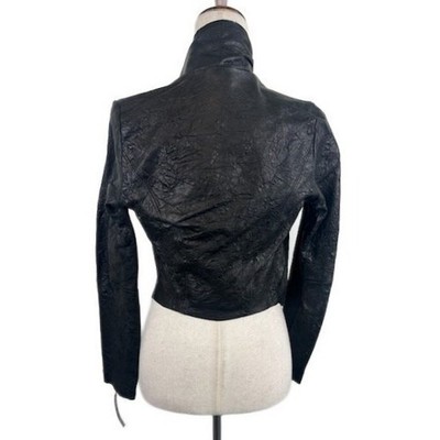 Keywords: leather jacket, black jacket, open front, waterfall drape, textured leather, cropped jacket, designer jacket, edgy style, evening wear, sophisticated, moto jacket