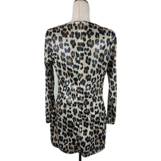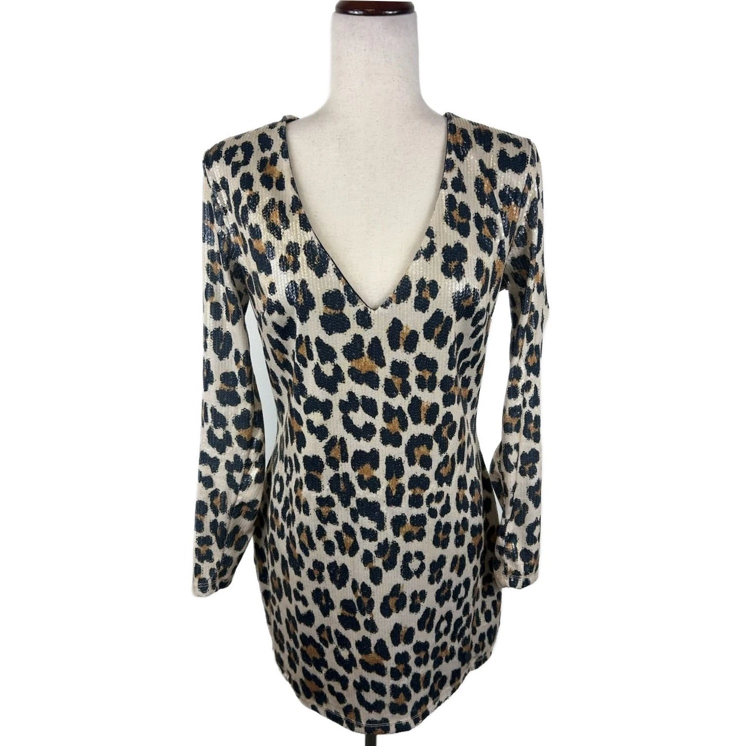 Leopard print long sleeve mini dress, perfect for making a statement! This dress features a flattering V-neckline and a bodycon silhouette that accentuates your curves. It is covered in a bold leopard print in tan, black and cream. Great for a night out with friends, a birthday party, or even a date.