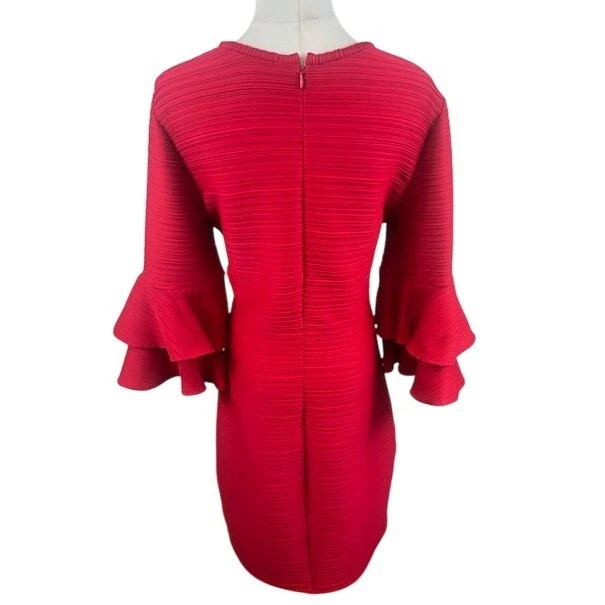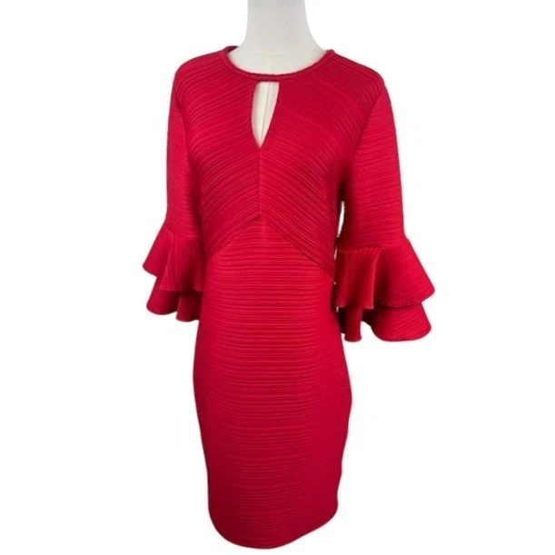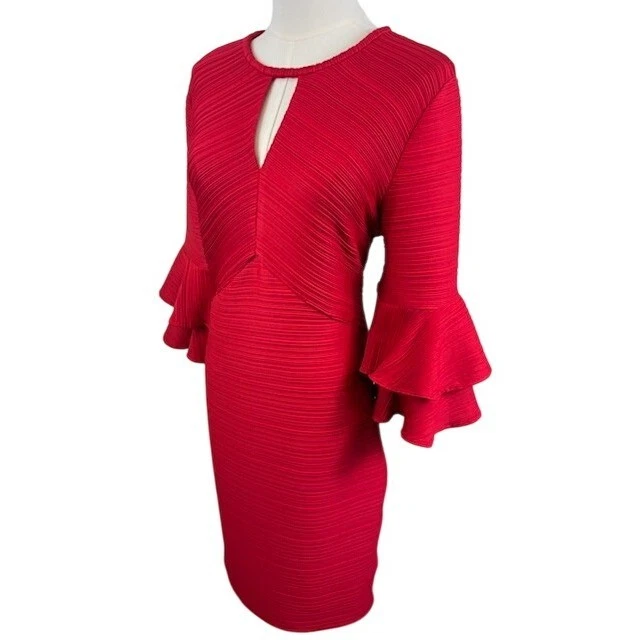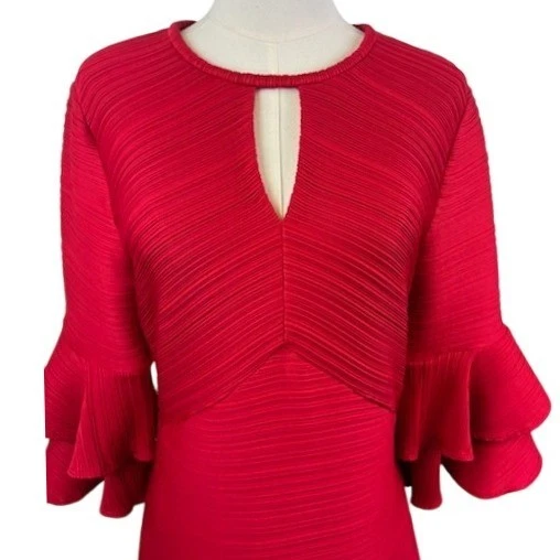 Command attention in this vibrant red dress, a statement piece designed to turn heads. The unique pleated texture adds depth and sophistication, while the keyhole neckline offers a touch of allure. Flattering bell sleeves create a dramatic flair, ensuring you make a memorable entrance. This dress is perfect for cocktail parties, special events, or a night out where you want to exude confidence and style.