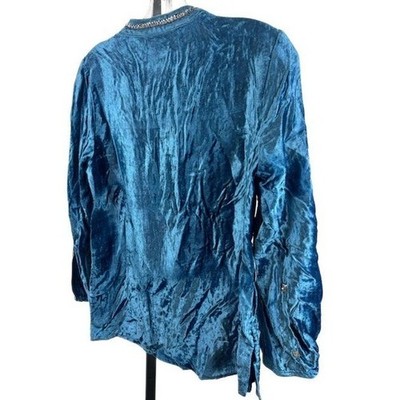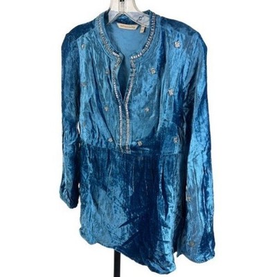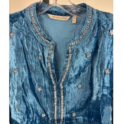 This top measures 27 inches in length. A Soft Surroundings blue velvet tunic top. This beautiful top showcases a V neckline with intricate beading and sequin embellishments, extending down the front placket and scattered across the sleeves. The crushed velvet texture lends a luxurious feel and visual depth, while the long sleeves offer comfortable coverage. Its flowy silhouette and unique detailing make it perfect for a stylish evening out or a festive holiday gathering.