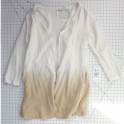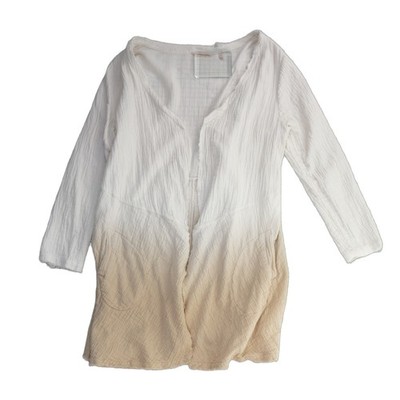 Excellent Condition! Soft cotton-blend gauze fabric creates a breathable, lightweight layer perfect for transitional weather. This open-front cardigan features a striking ombre dip-dye effect transitioning from a crisp white to a warm sandy beige. Designed with a relaxed silhouette, it includes long sleeves, a raw-edge finish for a touch of bohemian flair, and functional side pockets. The textured crinkle gauze material adds visual depth, making it an effortless choice for beach outings or casual weekend wear.