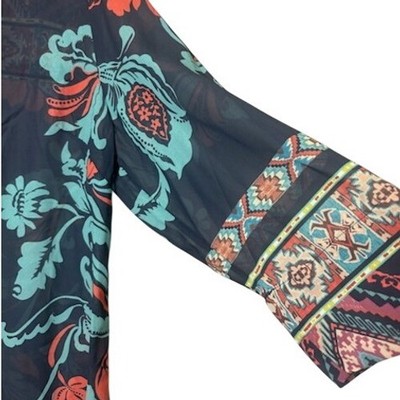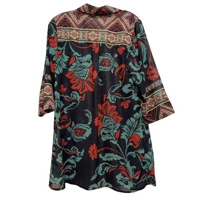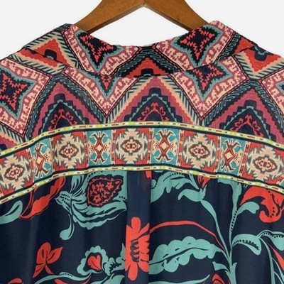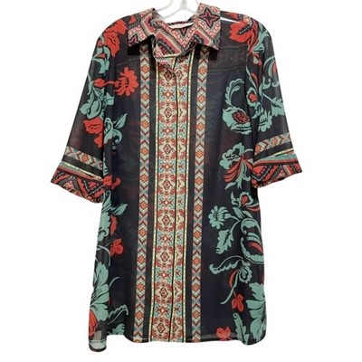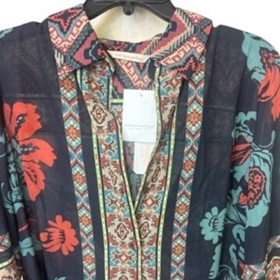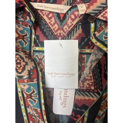 Evoke a sense of wanderlust with this Soft Surroundings button-down shirt, where vibrant floral patterns dance across a lightweight fabric, creating a mesmerizing tapestry of color and texture. The intricate design features a mix of bold blooms and geometric accents, offering a unique blend of bohemian charm and modern sophistication. The relaxed fit and soft material ensure all-day comfort, while the button-down style allows for versatile styling options â wear it open as a breezy layer or buttoned up for a more polished look. Perfect for a casual brunch with friends, a weekend getaway, or adding a pop of color to your everyday wardrobe.