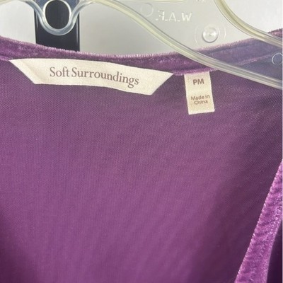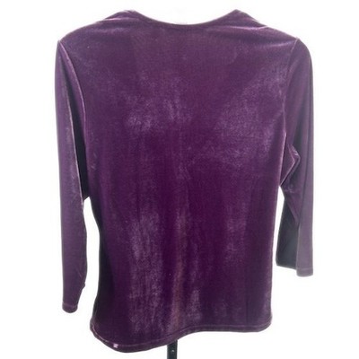 A soft velvet wrap top in a rich purple hue. This elegant top features a flattering V-neckline and a draped, ruched detail at the side seam, creating a sophisticated silhouette. The 3/4 sleeves add a touch of refinement. Perfect for a dinner date, holiday gathering, or a chic evening out.
