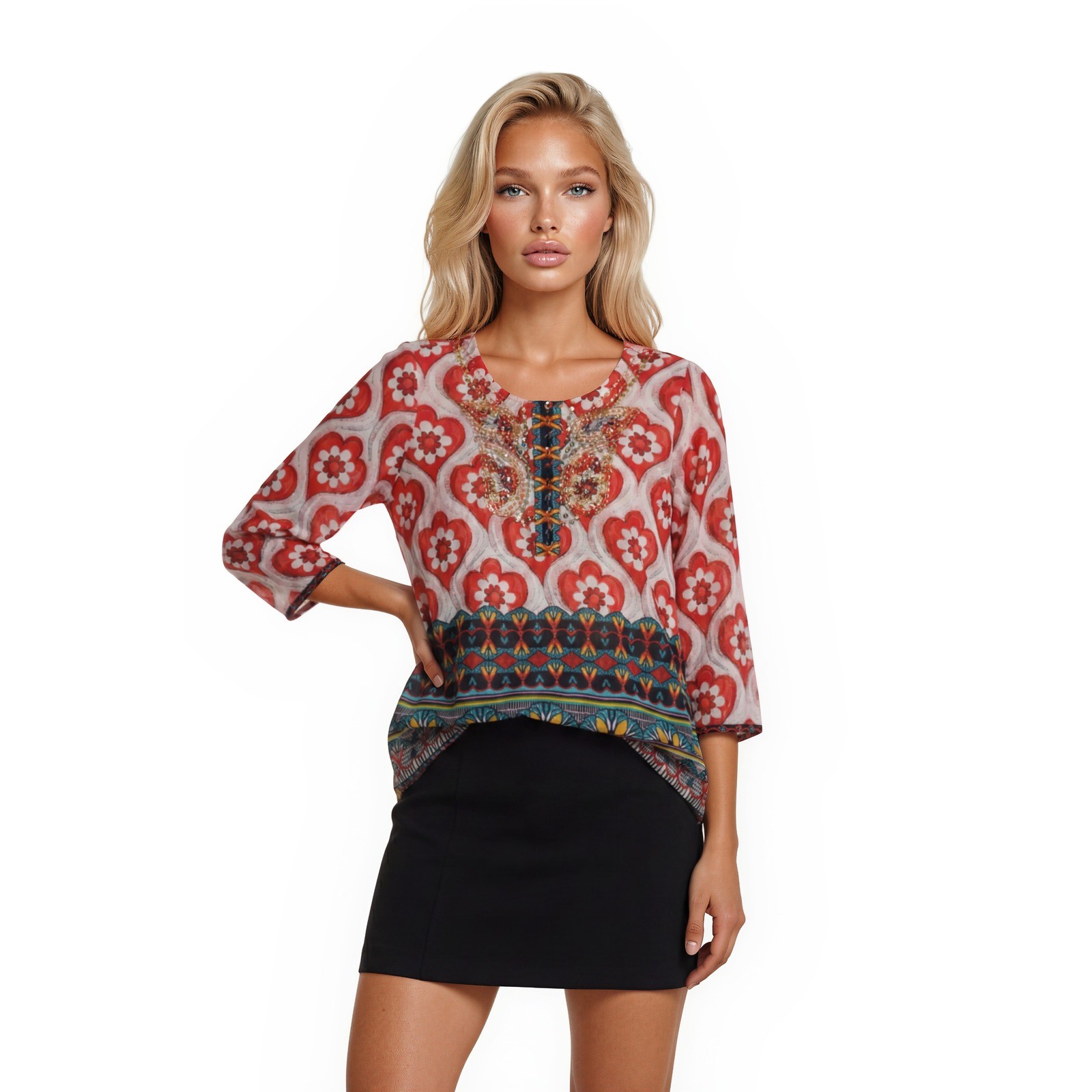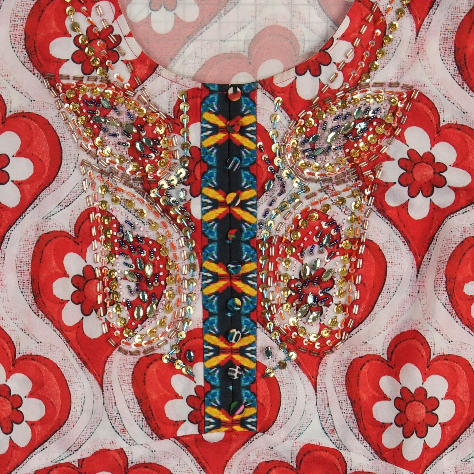 Keywords: Boho, Bohemian, Eclectic, Festival, Embellished, Heart Print, Mixed Media, Colorful, Lightweight, Summer, Spring, Casual, Chic, Hippie, Gypsy