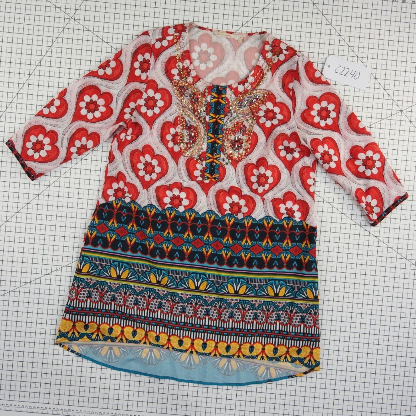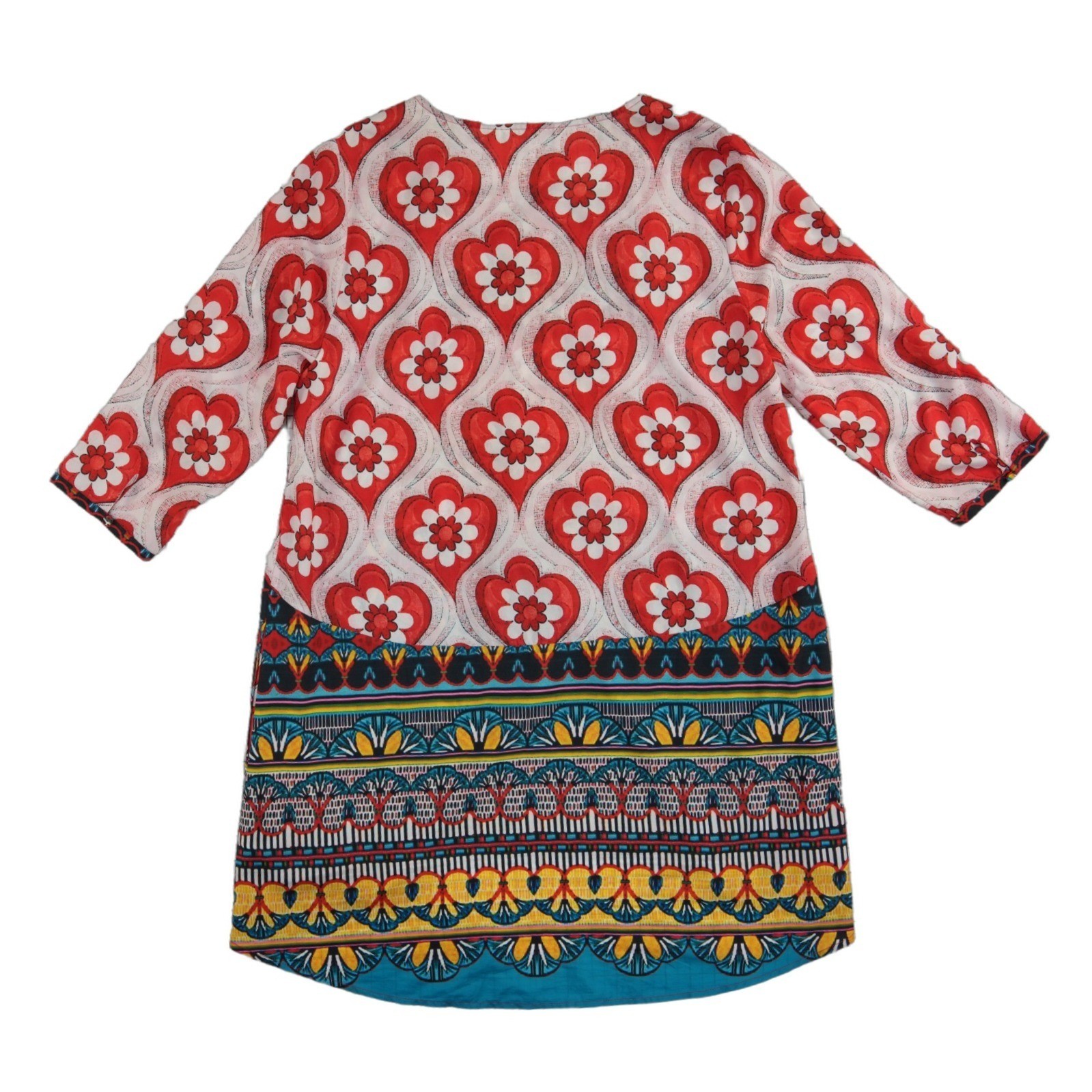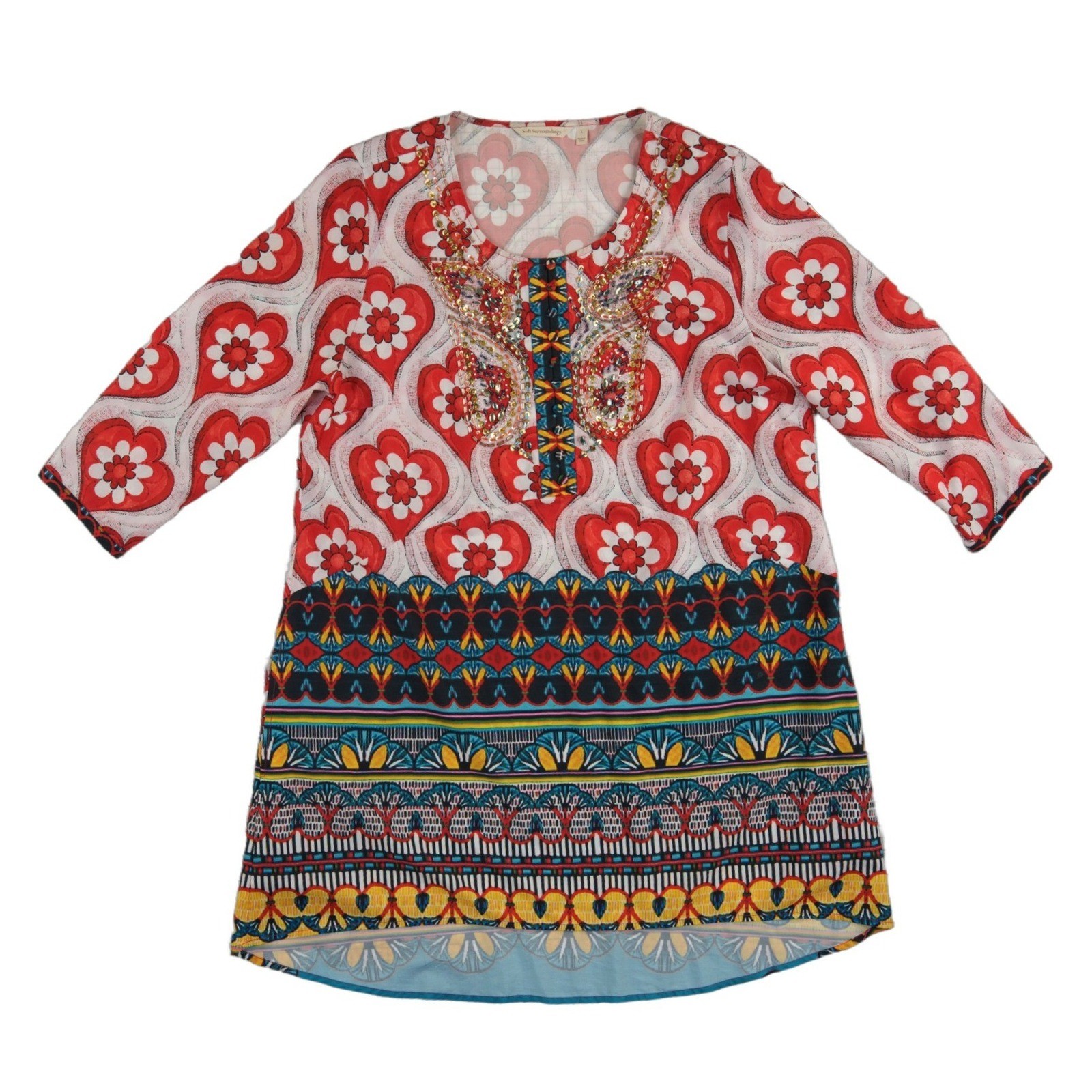 Excellent Condition! Soft Surroundings tunic top showcases a vibrant mixed print featuring oversized hearts and intricate bohemian borders. The neckline is beautifully accented with a butterfly-shaped sequin and bead embellishment, adding a touch of sparkle to the lightweight fabric. Designed with a relaxed fit, it includes 3/4 length sleeves and a high-low hemline that provides flattering coverage. This versatile piece transitions effortlessly from casual daytime wear to an evening out.
