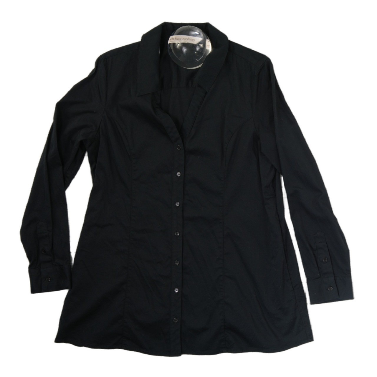 Excellent Condition! Classic button-tunic offers a polished silhouette with a comfortable stretch-cotton blend. This long-sleeve shirt features a point collar and a curved hemline that provides flattering coverage, making it a versatile staple for professional or casual ensembles. The structured seams through the bodice create a tailored look while the spandex ensures ease of movement throughout the day.