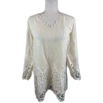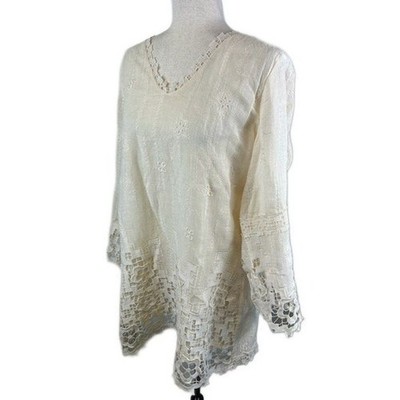 Beautiful bohemian-style tunic from Soft Surroundings. Features delicate floral embroidery throughout the garment, complemented by intricate lace trim along the V-neckline, sleeves, and hem. The long sleeves and relaxed fit make it a comfortable yet stylish choice. Lightweight and breathable, this tunic is perfect for warm weather outings or casual gatherings, adding a touch of elegance to any ensemble. Would be ideal for brunch with friends or a relaxed day at the beach.