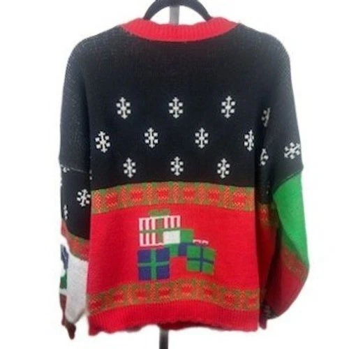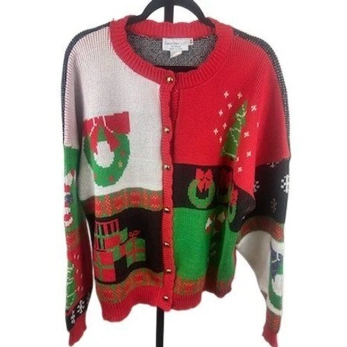 This Christmas sweater measures 27 inches in length with 19 inches sleeve length. A festive holiday cardigan sweater for women featuring a vibrant patchwork design. This cozy knit showcases various Christmas motifs including wreaths, Christmas trees, candy canes, and wrapped presents across a color block background of red, white, and black. The button-front closure adds to its classic cardigan style, making it perfect for holiday parties, family gatherings, or casual festive wear.