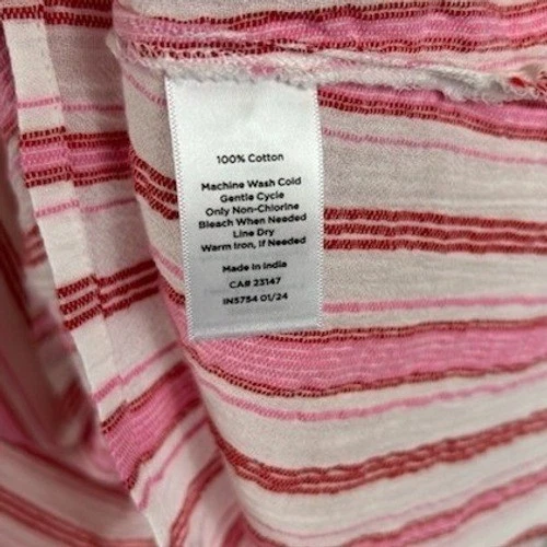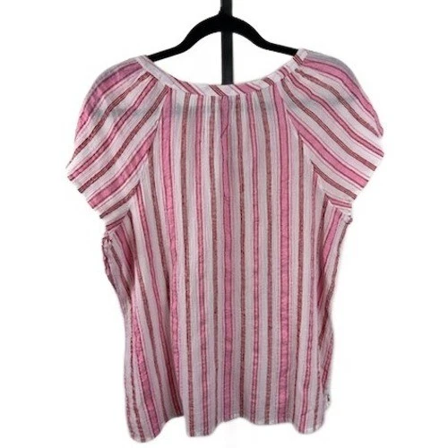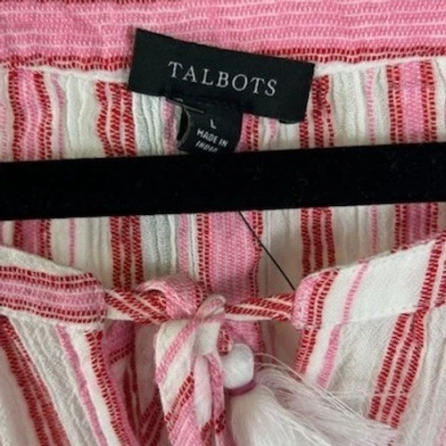 Talbots blouse featuring a pink and white stripe pattern. This top has a tie neck with a tassel detail and short flutter sleeves. Perfect for a casual day out or a relaxed vacation.