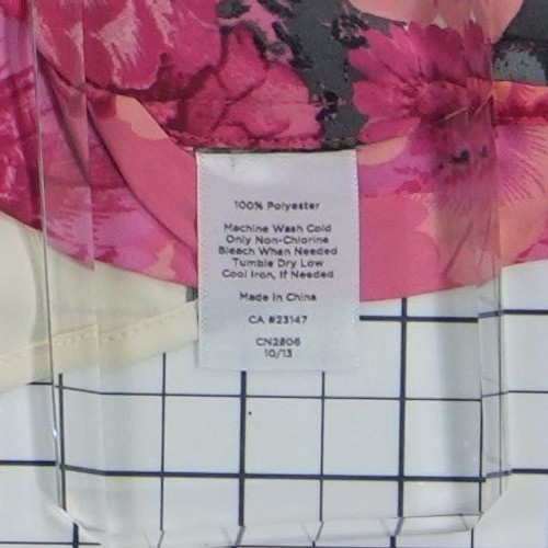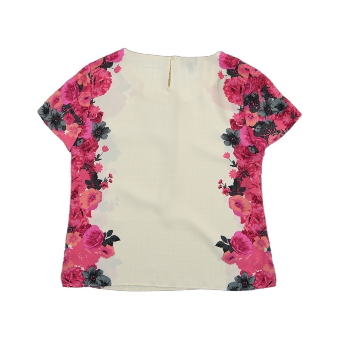 Excellent Condition! Lightweight polyester blouse features a vibrant pink and orange floral border print against a cream background with a subtle grid texture. Designed with a rounded neckline with gentle pleating and short sleeves, it offers a polished look suitable for the office or casual outings. The back includes a keyhole closure with a single button for easy wear.