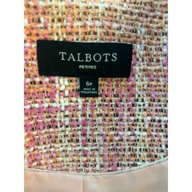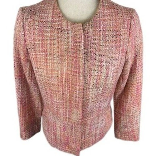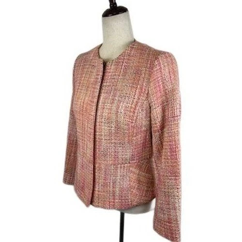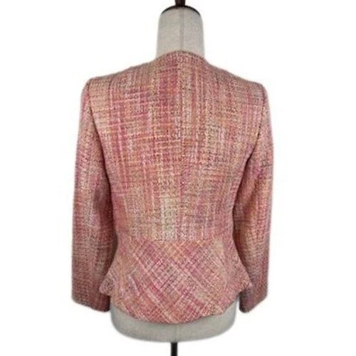 Charming tweed blazer, perfect for adding a touch of sophistication to any outfit. The blazer features a beautiful blend of pink, orange, and cream tones woven into a classic tweed texture. It has a round neckline, a single hook-and-eye closure, and subtle front pockets. The tailored fit and peplum hem create a flattering silhouette, making it ideal for professional settings, business meetings, or a stylish brunch with friends.