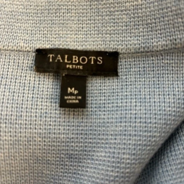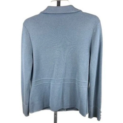 Talbots Petite knit blazer in a lovely light blue hue. This stylish jacket features a classic notched lapel, a two-button closure, and two front flap pockets. The cuffs are adorned with decorative buttons. Its refined design makes it a perfect choice for business casual settings or sophisticated weekend outings.