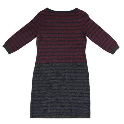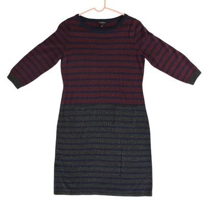 Talbots Petites sweater dress combines a classic striped pattern with a sophisticated color-blocked design. Crafted from a soft wool blend, this knit piece features a rich burgundy and navy bodice paired with a textured grey and navy skirt. The 3/4 length sleeves and modest scoop neckline make it a versatile choice for office wear or seasonal gatherings.