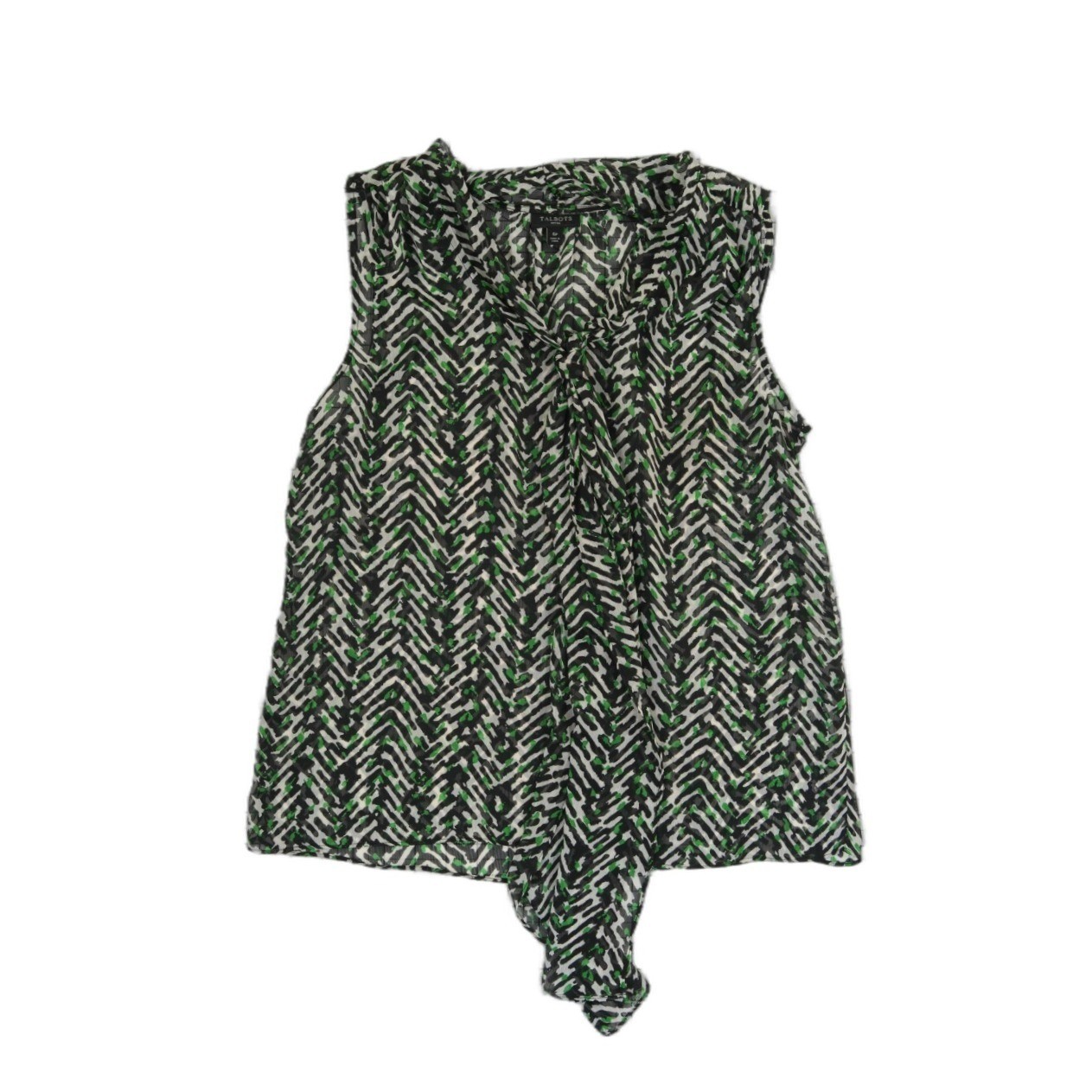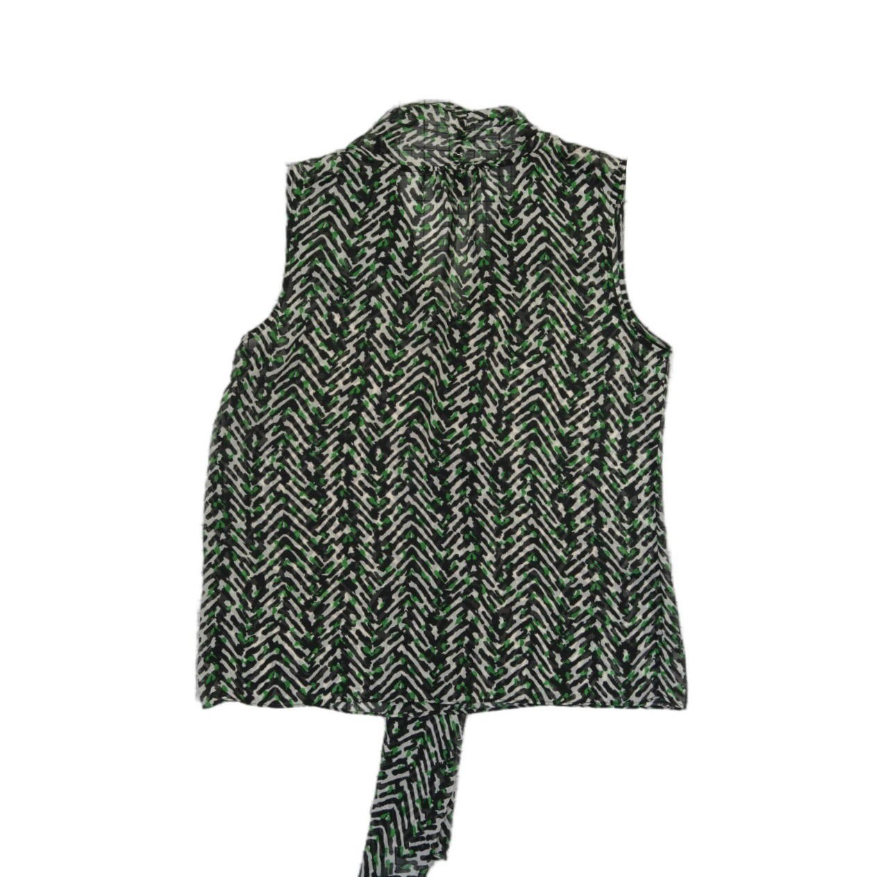 Excellent Condition! Lightweight sleeveless blouse offers a sophisticated look with its intricate geometric chevron pattern in a vibrant green, black, and white color palette. The airy, semi-sheer fabric creates a graceful drape, while the elegant tie-neck detail adds a classic touch of femininity. Perfect for layering under a blazer for the office or wearing alone for a polished daytime ensemble, this versatile top combines modern print with timeless tailoring.
