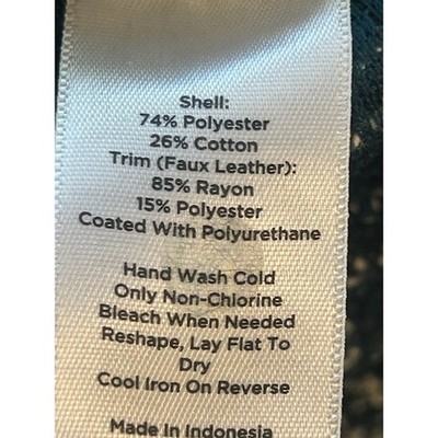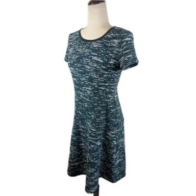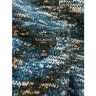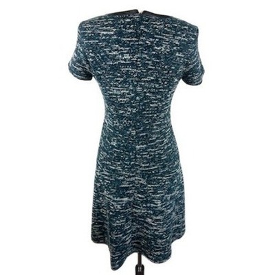 Keywords: Talbots, Petites, Dress, Tweed, Knit, Blue, Green, Career, Casual, Short Sleeve, A-Line, Crew Neck, Faux Leather Trim