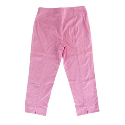 Classic side-zip cropped pants in a vibrant pink seersucker fabric offer a polished yet breezy look. These trousers feature a flat front with a discreet side zipper closure for a smooth silhouette, complemented by subtle back darts and small vents at the hems. The textured cotton-blend material provides a hint of stretch for comfort throughout the day.