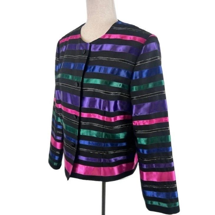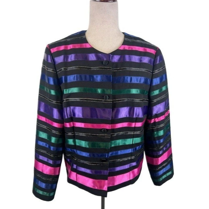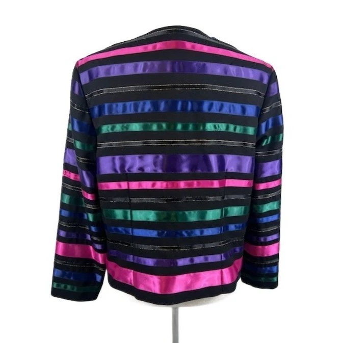 Striking vintage blazer that features a unique design. A bold statement piece with vibrant pink, purple, green, and blue horizontal stripes, accented with subtle metallic gold threads. It has a classic button-front closure and a flattering silhouette, offering both structure and style. Wear this blazer to your next cocktail party or for any other special occasion.