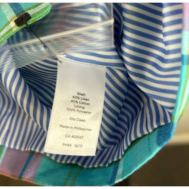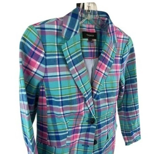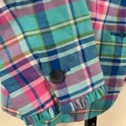 Talbots women’s plaid blazer jacket in a vibrant blue pink and green multi color. It has an 18 inches pit to pit when laid flat. This tailored blazer features a classic lapel and a single button closure. The sleeves are finished with a charming ruffle detail adding a feminine touch. The interior lining boasts a crisp blue and white stripe pattern. Perfect for a smart casual outing or a business casual office setting.