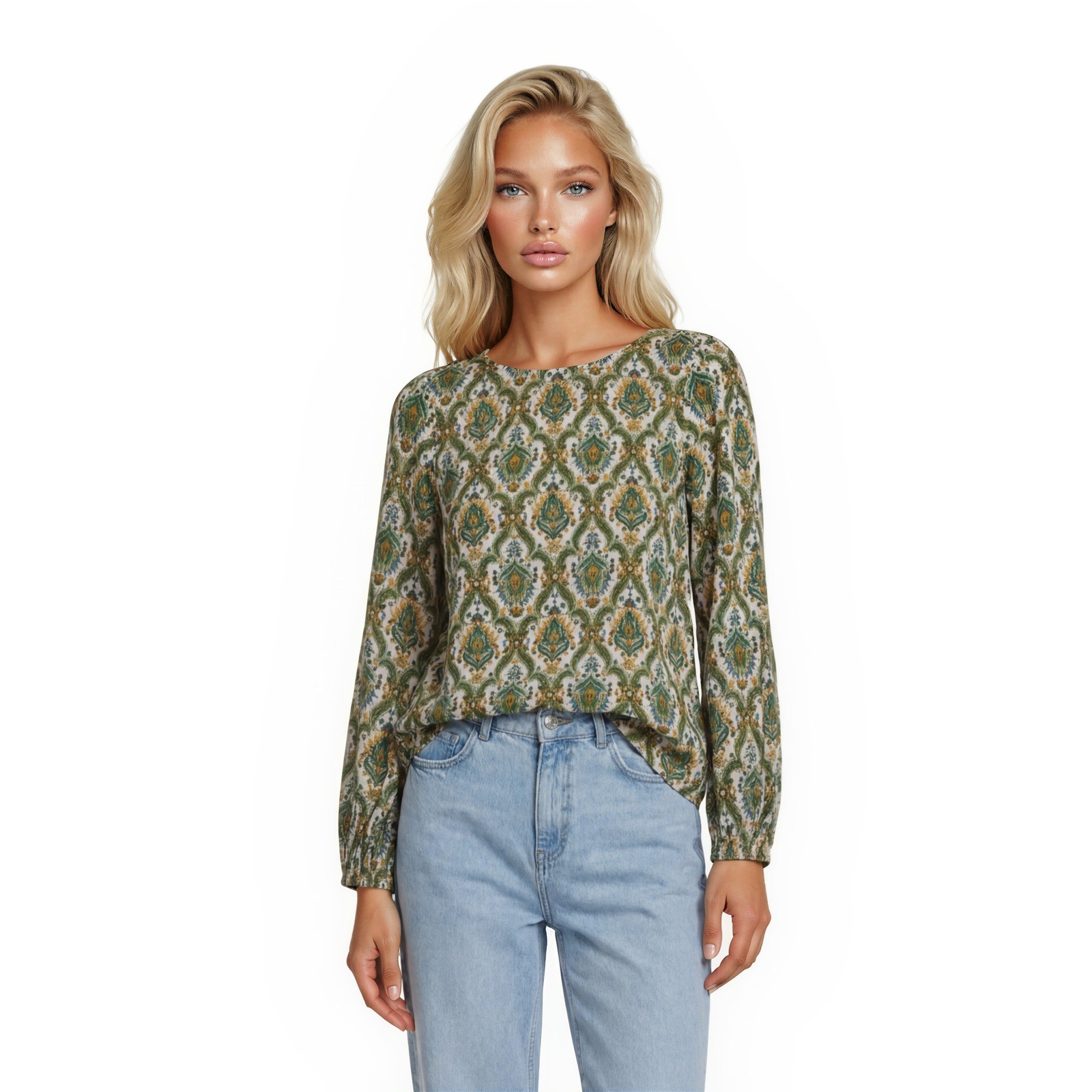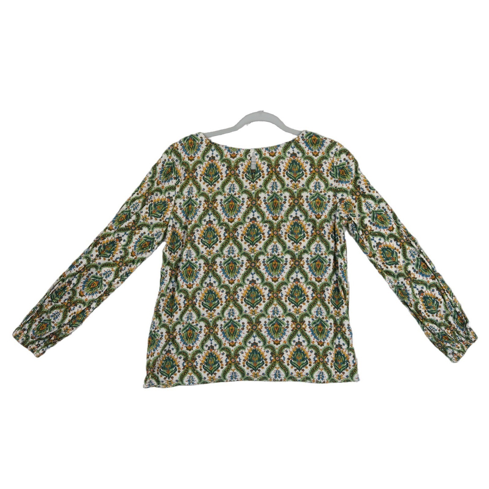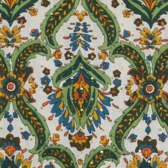 Lightweight cotton-blend top showcases a vibrant botanical paisley print in shades of green, blue, and orange. Vertical gold metallic lurex threads run throughout the fabric, adding a subtle shimmer and texture. This airy piece features a split neckline and a relaxed fit, making it an ideal choice for warm-weather styling or vacation wear.