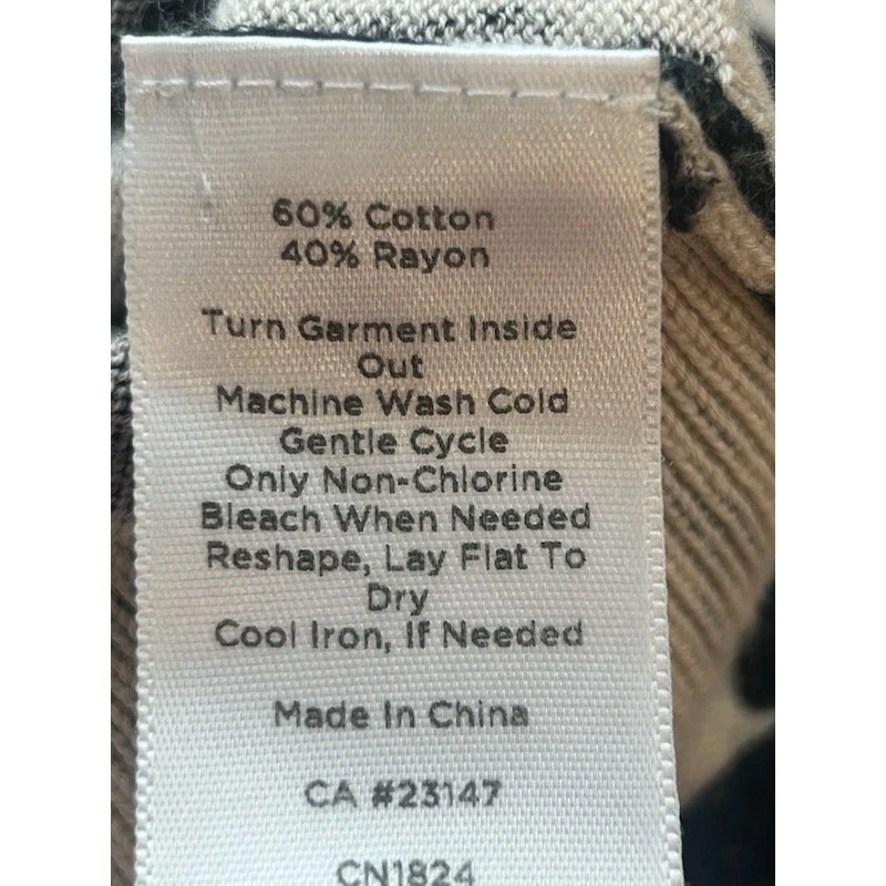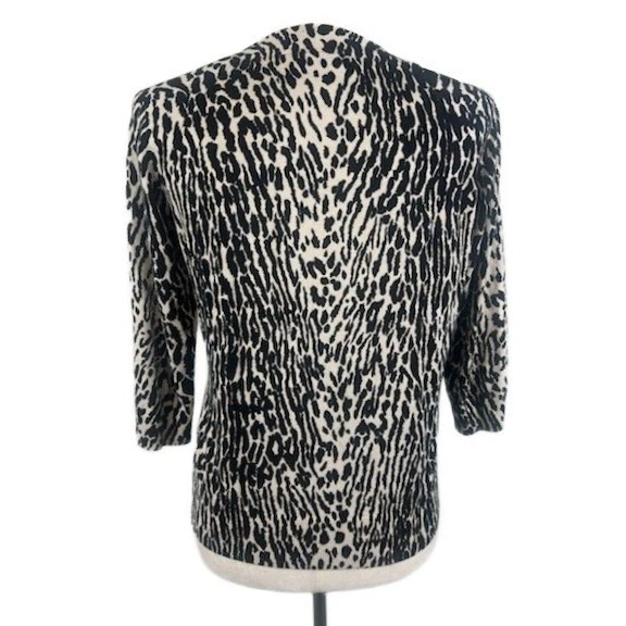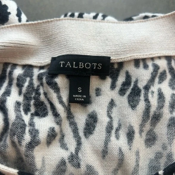 Talbots leopard print cardigan sweater. This stylish piece features a classic crew neckline, three-quarter length sleeves, and a button-up front closure. The bold leopard pattern in black and beige makes it a versatile addition to any wardrobe. Perfect for layering over a camisole or a basic tee for a chic casual look or for adding a touch of personality to your office attire.