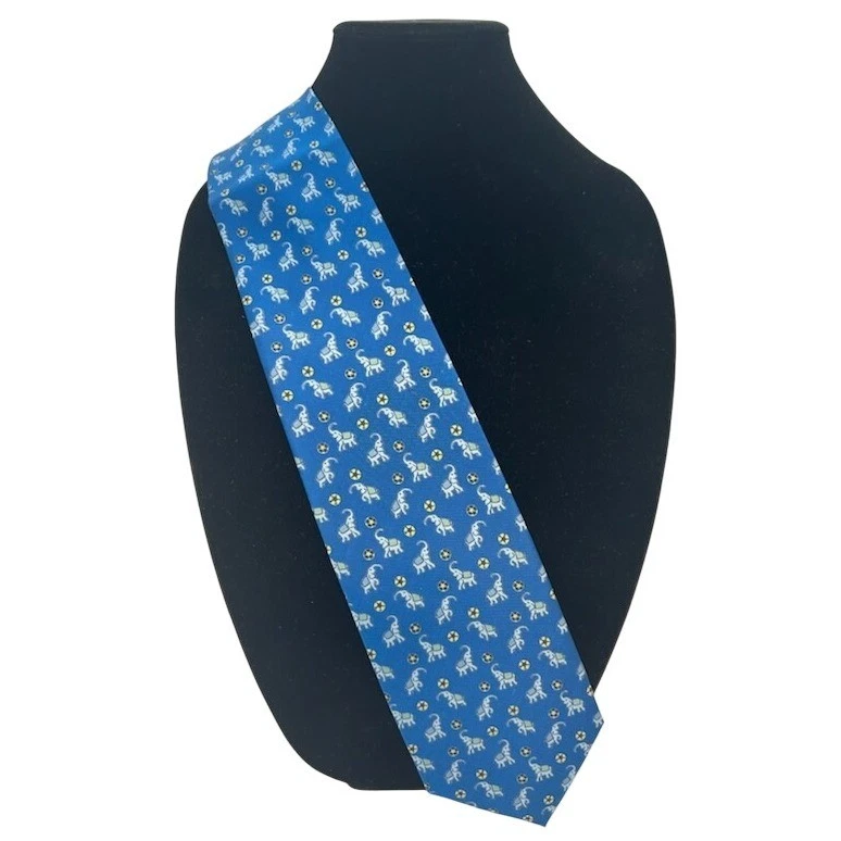 A whimsical touch for the discerning gentleman, this necktie presents a playful yet sophisticated statement. The vibrant blue backdrop serves as a canvas for a delightful pattern of gray elephants interspersed with charming yellow floral accents. Crafted with meticulous attention to detail, this tie exudes an air of refined elegance. Elevate your professional attire with a dash of personality, or add a touch of panache to your weekend ensemble. Perfect for adding a pop of color to business meetings, social gatherings, or even a casual Friday at the office.