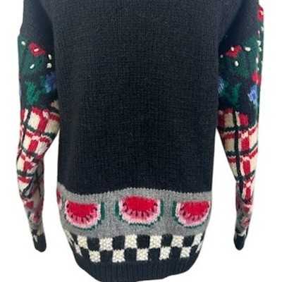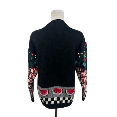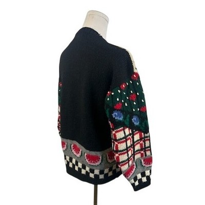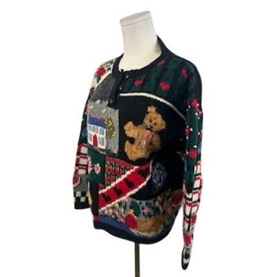 Whimsical charm abounds in this hand-knit wool sweater, a cozy masterpiece that tells a story with every stitch. A playful patchwork design features a delightful array of motifs, including a cuddly teddy bear, quaint houses, and vibrant floral patterns, all rendered in rich, textured detail. The unique button-up neckline adds a touch of vintage flair, while the intricate knitwork showcases exceptional craftsmanship. Perfect for adding a touch of homespun warmth to a casual weekend outing, a festive holiday gathering, or a cozy evening by the fire.